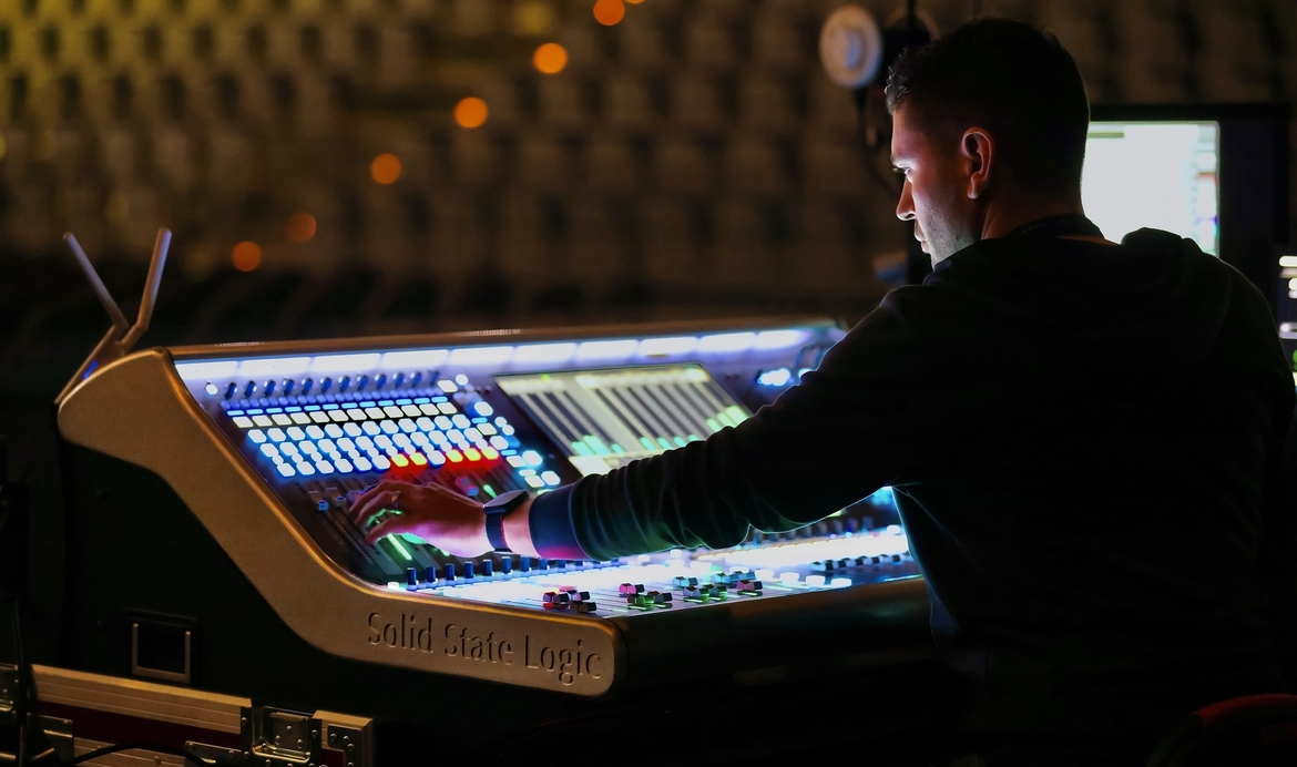 Während die Chöre, inklusive des jeweiligen Vocal Coaches auf der Bühne, im Stereopanorama hart links und rechts gepannt und dementsprechend trennscharf über die Stereobeschallung von DAS Audio wiedergegeben wurden, musste Melodus für die Nahfeldbeschallung der vorderen Publikumsreihen einen alternativen Weg finden, um die korrekte Ortung zu gewährleisten: „In einem klassischen Frontfill-Setup hat man normalerweise zwei Möglichkeiten: Entweder man fährt alle Lautsprecher Mono an oder im Wechsel Links-Rechts“, erläutert Oliver Tschotow, Melodus-Geschäftsführer und FOH-Engineer auf der 6K UNITED! Tour. „Während in Mono überhaupt kein Stereobild erzeugt wird, führt die zweite Variante dazu, dass das Stereobild, je nach Sitzposition, wechselt und verfälscht dargestellt wird.“
