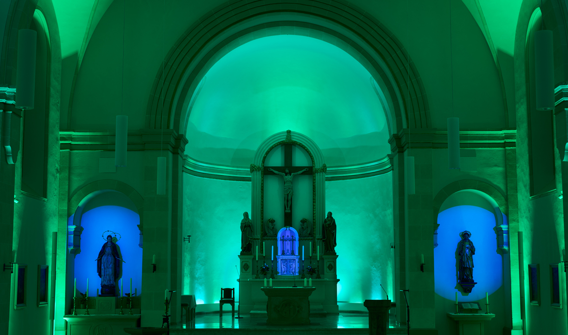 Von Schröder & Partner wurden Prolights ArcPod 15Q LED-Fluter mit RGBW-Bestückung und einer 25° Diffusor-Linse für die farbige Ausleuchtung der Seitenwände und Rundbogendecken auf dem Boden platziert sowie mit einer 45° Linse ausgestattet, zur Beleuchtung der Altarkuppel genutzt.
