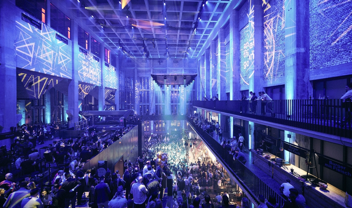 Das Atrium bildet mit seiner 25 Meter hohen Decke den beeindruckenden Mittelpunkt der ehemaligen Heizwerkhalle und kann künstlerisch wie gastronomisch auf unterschiedliche Art bespielt werden. Gemeinsam mit der umlaufenden Beletage im ersten Stock ergeben sich zahlreiche Möglichkeiten für Konzerte, Ausstellungen, Dinner, Partys und mehr. Sobald der Blick nach oben wandert, fallen unweigerlich die sechs Traversen-Rechtecke direkt unter der Decke auf, die jeweils mit vier Martin MAC Viper XIP bestückt sind. Mit ihrem hohen Lichtoutput füllen die Moving Lights den großen freien Raum problemlos mit scharfen Beams und kraftvollen Gobo-Projektionen.